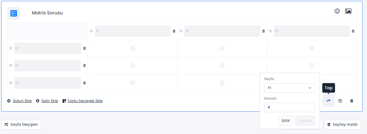 Sorular, altlarında bulunan Taşı (Move) butonu ile açılan pencere üzerinden aynı sayfa içinde veya farklı bir sayfadaki hedef konuma taşınabilmektedir. Taşıma sırasında, üzerinde kural (trigger) bulunan sorular için kullanıcı uyarılır. İşlem sırasında yeni bir kural oluşturulmaz; mevcut kural varsa, kullanıcının onay vermesi halinde otomatik olarak kaldırılarak taşıma işlemi tamamlanır.