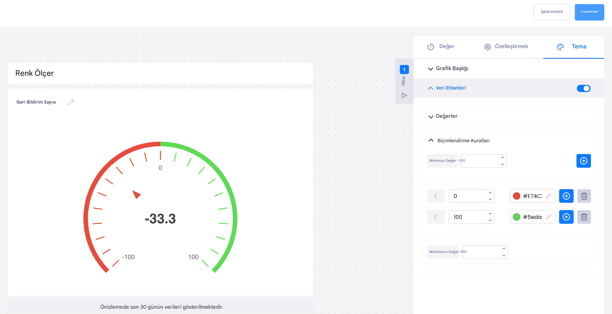 Tema → Veri Etiketleri → Biçimlendirme Kuralları bölümünde aralık tanımlamaları yapılarak, her bir aralık için farklı renklendirme kuralları belirlenebilir. Bu yapı sayesinde veri etiketleri, tanımlanan kurallara bağlı olarak otomatik şekilde renklendirilir.