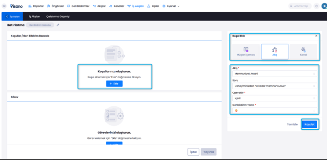 - Koşullarınızı oluşturun > İlgili akışı, soruyu, yanıttaki değeri içeren/içermeyen operatörü seçmek için "EKLE"ye tıklayın. Aşağıdaki örnekte koşul, müşterilerin seçilen soruyu "Hiç Memnun Değil" olarak yanıtlamış olmalarıdır.