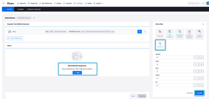 - Koşullarınızı belirledikten sonra Görev Oluştur > Görev Ekle > "Gecikme"yi seçin. Bu, ikinci kampanyanın kullanıcıya gönderilmesinden önce ne kadar zaman geçmesi gerektiğini belirlememizi sağlayacaktır. Bu değeri ihtiyaçlarınıza göre özelleştirebilirsiniz.