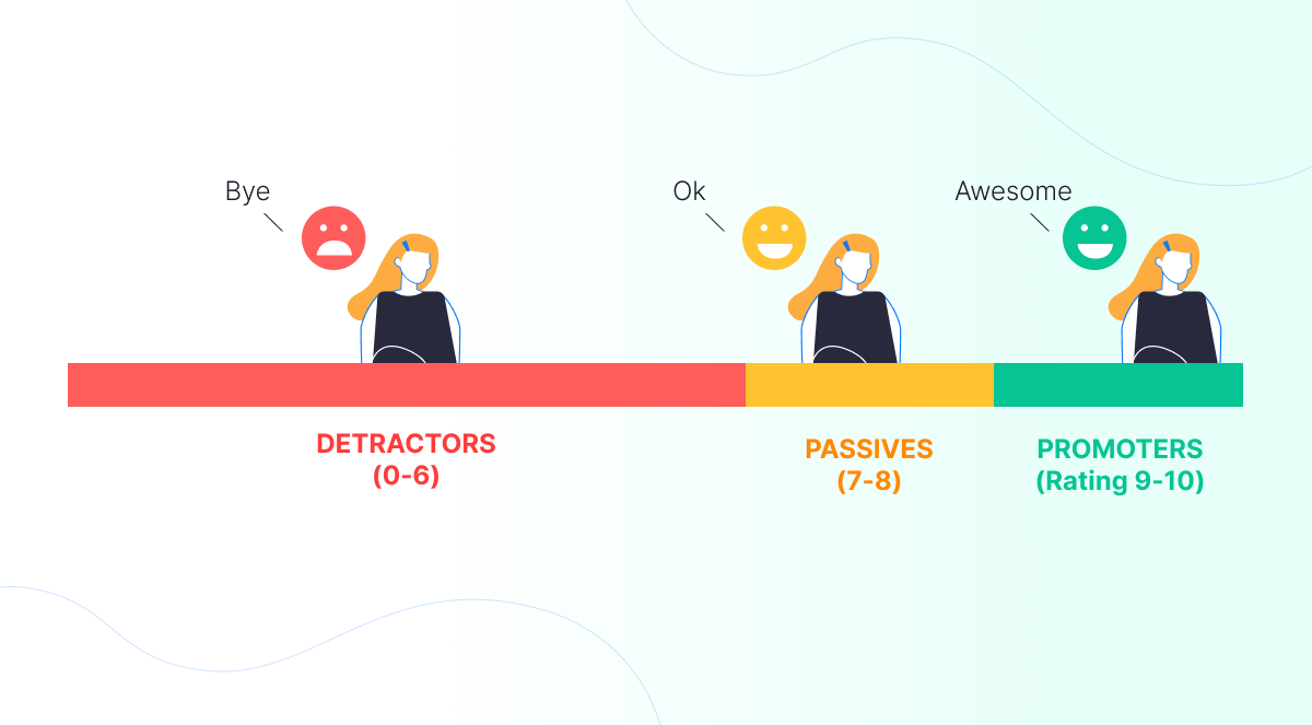 - 7 and 8: This group is called Passives. They are the customers who belong neither to the Detractor group nor the Promoter one. They will not promote your business or prevent them from interacting with it either.
