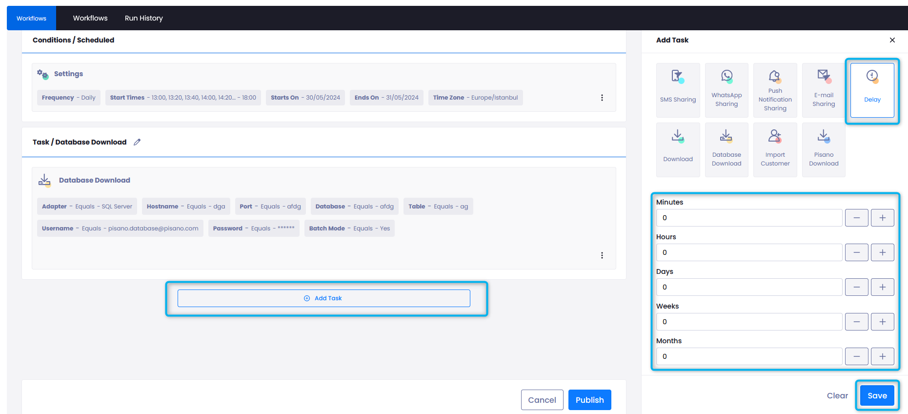 - If you would like this workflow to work at spesific times, click "Add Task" again and select Delay. Set your prefered delay time.