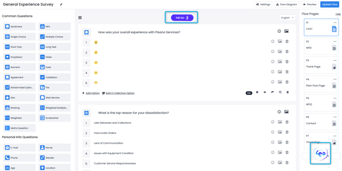 After creating your flow, you can use the "Ask Leo" button on top of the flow page to have Leo evaluate your survey. You can click on the logo at the bottom right corner to view your conversation history with Leo.