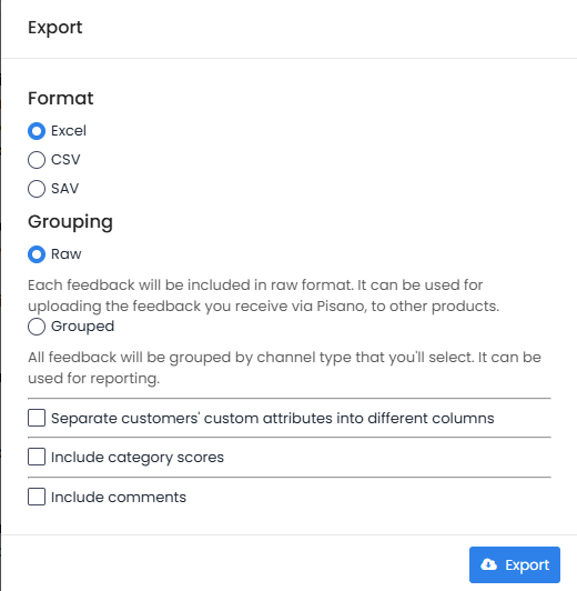On the screen that opens, you can receive your feedback as Excel or CSV, raw or grouped. You can also choose what information you'd like included.