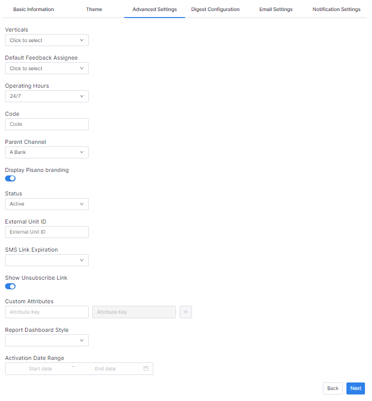 In the Verticals section, you can specify in which vertical area to use your channel. The default feedback assignee section allows you to determine who will be assigned and notified about the feedback from the channel. The operating hours section allows you to determine the times when your channel will be operational. By selecting the suitable option from 24/7 to Custom, you can determine the period in which you will receive feedback.