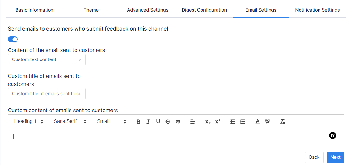 In the fourth and final stage, the Email Settings section, you can choose whether or not to send an email to customers leaving feedback through your channel.