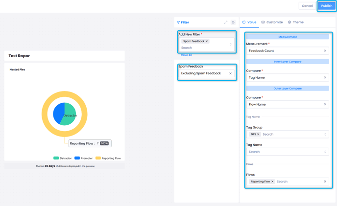 For example, to create a Nested Pie chart for the Feedback count of NPS tags from the Reporting flow while excluding all Spam feedback, you can follow the below steps: