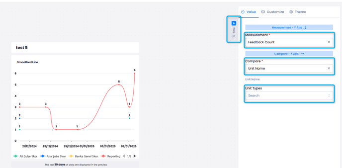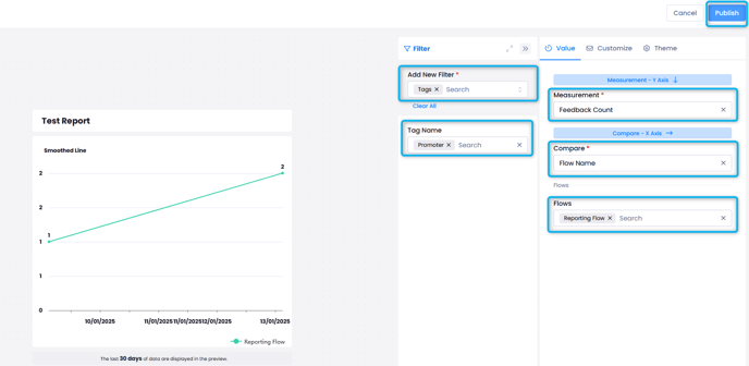 For example, to create a Smoothed Line chart for the NPS count of Promoter tagged feedback from the Reporting flow, you can follow the below steps: