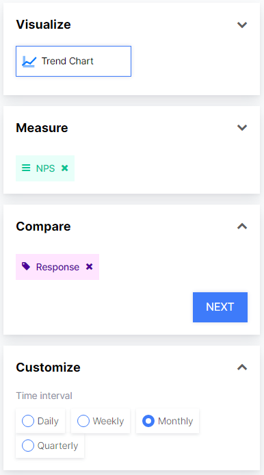 The following example shows the monthly trend of the NPS score of the selected survey.