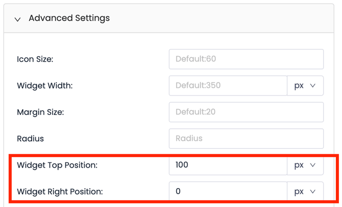 - The top and right positions of the Web Widget modal can now be set using both pixels (px) and percentages (%). With these positioning options, the widget modal can be placed anywhere on the screen as desired.