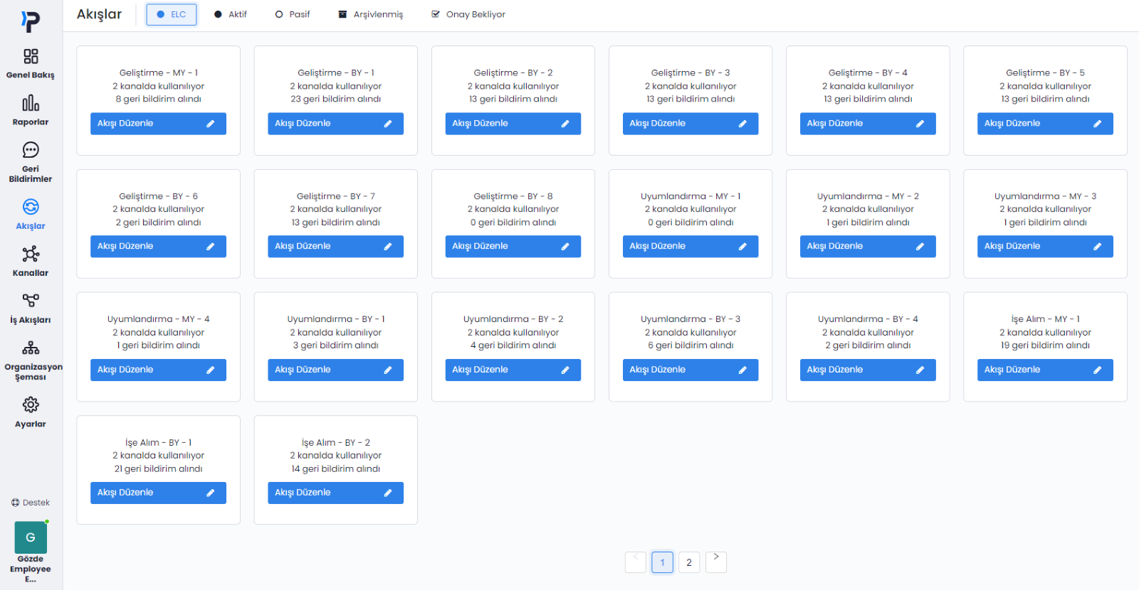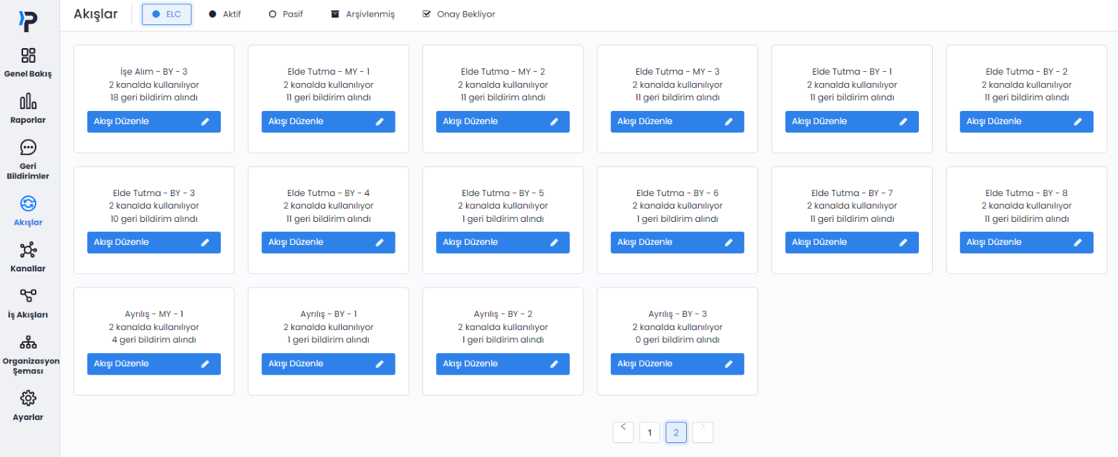 Bu kısım kullanıcı tarafından düzenlenemeyen, değişiklik yapılamayan hazır akışları kapsar. Buradaki akışların içindeki soruların sabit kalmasının sebebi, güvenilir ve karşılaştırılabilir veriler elde edebilmek içindir. Bu akışlar, ilgili fazlara göre belirlenen süreler içerisinde çalışanlara otomatik olarak gönderilir. Bu akışlara verilen cevaplar ELC skoruna dinamik olarak yansır. Bu akışlara geri bildirim bırakan tüm kullanıcıların bilgileri “Anonim” olarak görüntülenir.