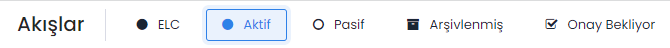 Akışlar menüsünde beş farklı durumda akış vardır; ELC, Aktif, Pasif, Arşivlenmiş ve Onay Bekliyor.