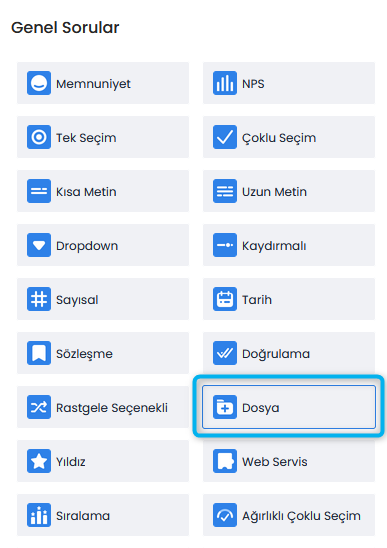 Bu soru tipini akışınıza eklemek için Akış oluşturma ekranının solunda bulunan soru menüsünden Dosya'ya tıklamanız yeterlidir.