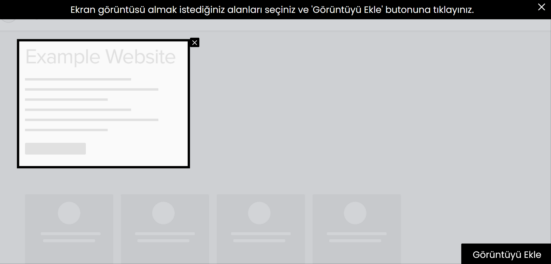 Ekran görüntüsü eklemek için butona tıklayan müşteriler aşağıdaki gibi bir ekranla karşılaşacaktır, bu ekrandan sayfada bulunan herhangi bit şeyin görüntüsünü çekerek geri bildirimlerine ekleyebilirler.