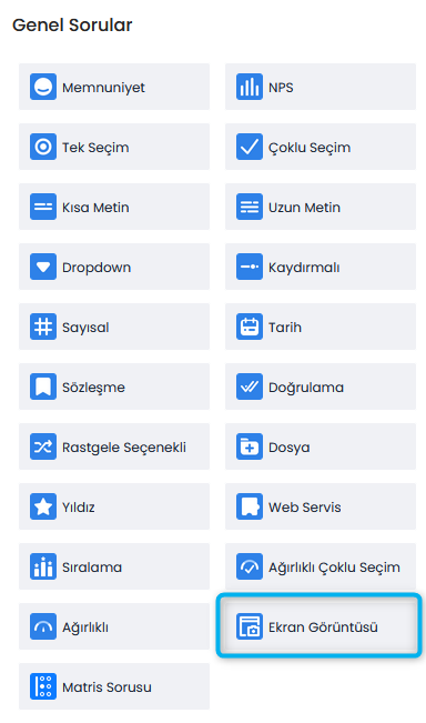Bu soru tipini akışınıza eklemek için Akış oluşturma ekranının solunda bulunan soru menüsünden Ekran Görüntüsü'ne tıklamanız yeterlidir.