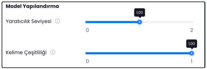 - Model yapılandırmada, Yaratıcılık Seviyesi ve Kelime Çeşitliliği dil modeli çıktısını nasıl kontrol ettiğimizi belirleyen iki önemli parametredir. Daha tutarlı veya daha yaratıcı çıktılar vermek istediğinizde bu değerlerle oynayabilirsiniz. Varsayılan olarak tanımlanmış gelecektir.