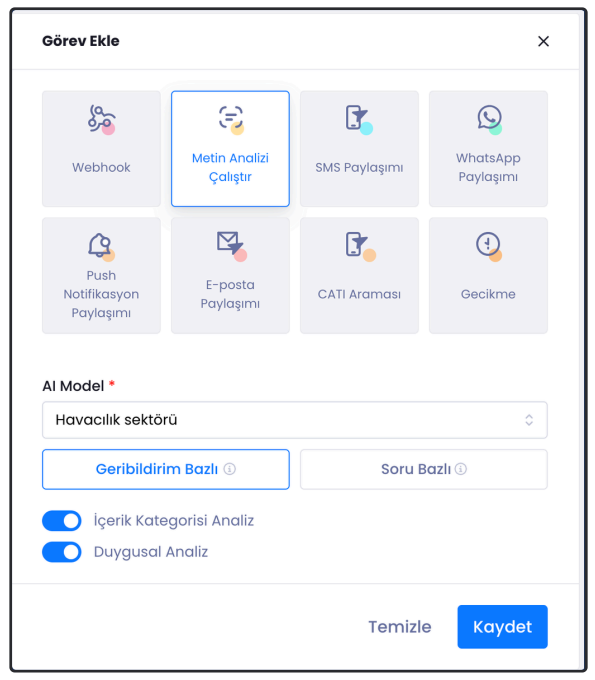 Kaydet butonuna tıkladıktan sonra Metin Analizi Çalıştır görevi açılır ve AI model otomatik seçili gelecektir.