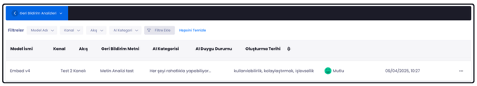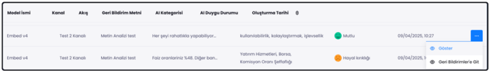 - Açılan ekranda Model İsmi, Kanal, Akış, Geri Bildirim Metni, AI Kategori, AI Duygu Durumu ve Oluşturulma Tarihi gibi sütunlar bulunmaktadır.