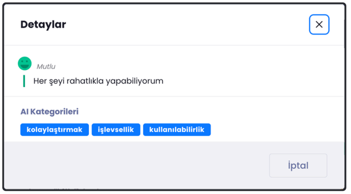 Bu özellik, yapay zeka ile müşteri geri bildirimlerini anlamlandırmak, duygu analizi yapmak ve belirli kategorilere ayırmak için geliştirilmiştir.