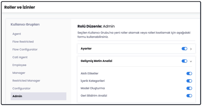 Rol ve İzinler menüsünde yer alan ilgili rol grupları için menü yetkilendirmesi yapılmalıdır.