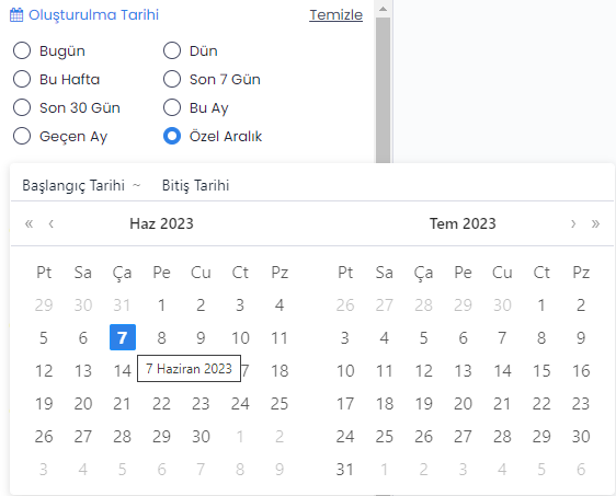 Özel aralık seçeneğiyle istediğiniz tarih aralığını seçebilirsiniz.