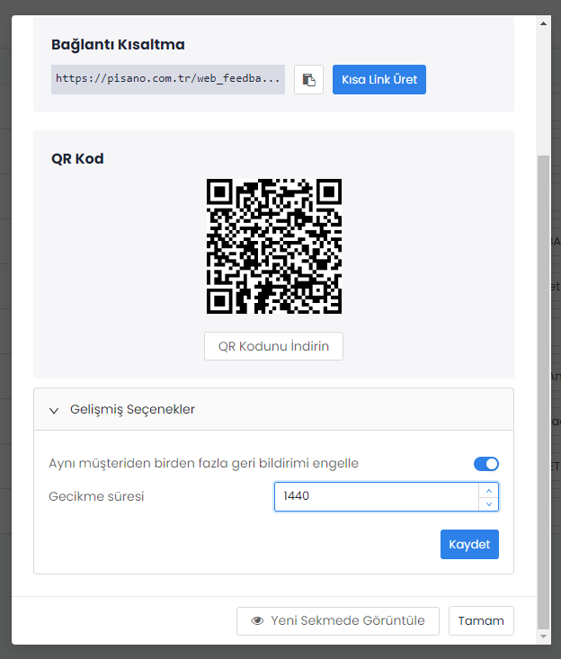Link Kanalları > Yayınla kısmında çıkan ekrandan Gelişmiş Seçenekler tıkladıktan sonra "Aynı müşteriden birden fazla geri bildirimi engelle" seçeneğini aktif ederek geri bildirim almayı engelleyebilirsiniz.