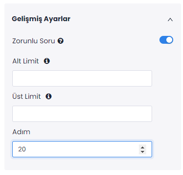 Gelişmiş Ayarlardan soruyu zorunlu yapabilir, Alt ve üst limit belirleyebilir (Örneğin yalnızca 50-75 arası bir değer giriniz gibi) ya da adım aralığını belirleyebilirsiniz.
