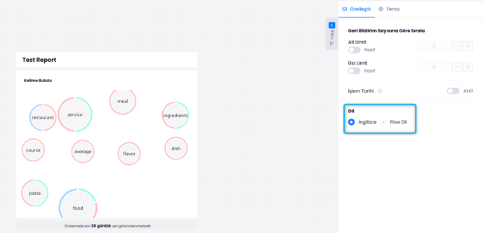 - Ortada, verilerinizin son 30 gündeki geri bildirimlere dayalı olarak nasıl görüneceğine dair bir önizleme göreceksiniz. Kelime Bulutu ile ek filtreler seçmenize gerek yoktur. Hesap genelinde çalışır.