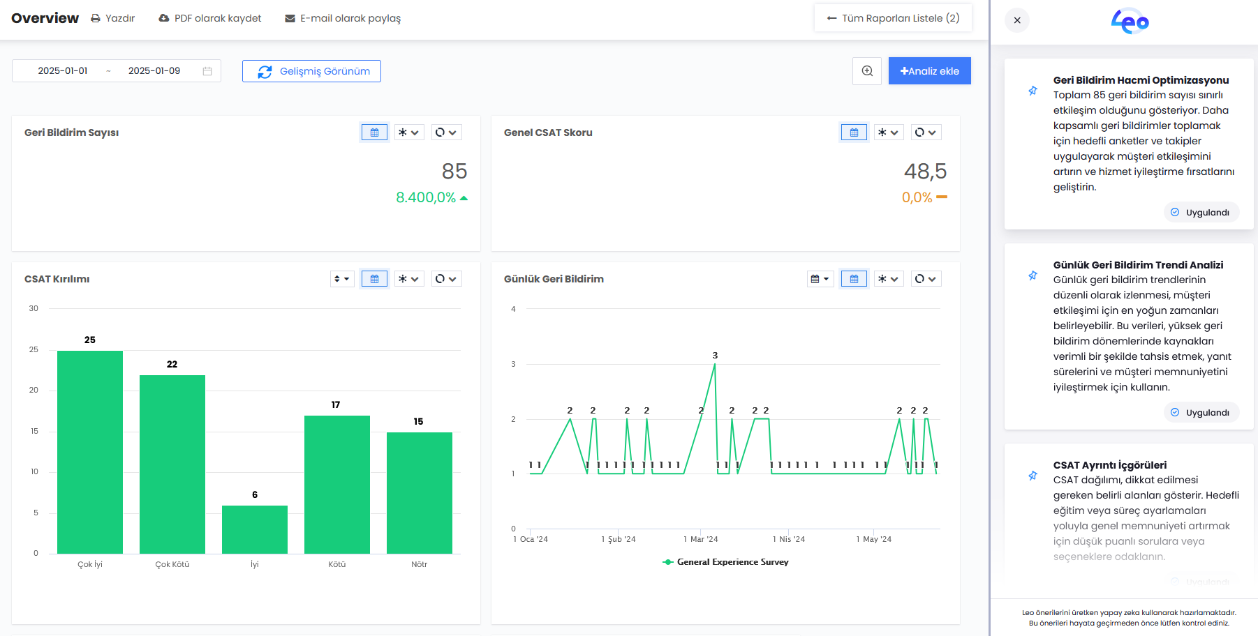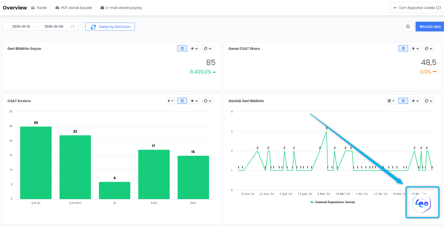 "Leo ile Rapora Git" seçeneğini tıkladığınızda kullanıcı, sağ bölmede gösterilen sabitlenmiş notların bulunduğu kontrol paneline yönlendirilir.