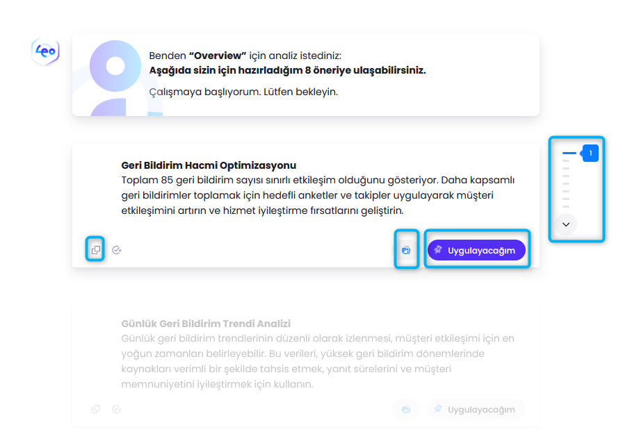 Bir analiz tamamlandıktan sonra tavsiye, "Uygulayacağım" düğmesi aracılığıyla daha sonra takip edilmek üzere sabitlenebilir.