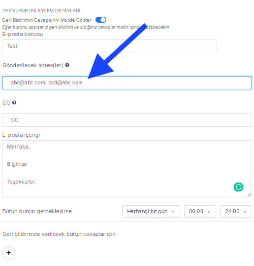 ''Tetiklenecek Eylem Detayları''ndan eklenmek istenen email adresleri yazılır, silinmek istenenler silinir.