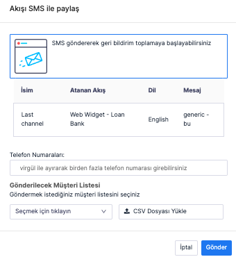 Paylaş tıklayarak, açılan pencerede müşterilerinizin cep telefon numaralarını manuel olarak ayrı ayrı girebilir veya CSV dosyası olarak yükleyebilirsiniz. Ardından, Gönder'i tıklayarak akışı müşterilerinizle paylaşabilirsiniz.