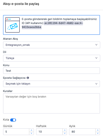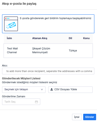 Paylaş tıklayarak, açılan pencerede müşterilerinizin e-mail adreslerini manuel olarak ayrı ayrı girebilir veya CSV dosyası olarak yükleyebilirsiniz. Ardından, Gönder'i tıklayarak akışı müşterilerinizle paylaşabilirsiniz.