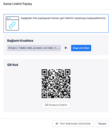 Kanalınıza bir akış atadıktan sonra, Yayınla butonuna tıklayın. Açılan Kanal Linkini Paylaş sayfası içerisinde bu kanala özel yaratılan uzun linki kullanarak geri bildirim toplamaya başlayabilirsiniz. Müşterilerinize kısa link göstererek geri bildirim sayfasına yönlendirmek isterseniz, Kanal Linkini Paylaş sayfasının sağ alt kısmında buluna Kısa Link Üret butonuna tıklamanız yeterli olacaktır.