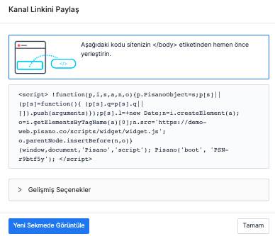 Oluşturduğunuz akışa göre, web siteniz üzerinden müşterilerinizle anında iletişime geçebilmek için Pisano’nun web widget kanalını canlı bir görüşme aracı olarak kullanabilirsiniz. Web widget kanalınızı oluşturduktan sonra, Yayınla butonuna tıklayın ve ekrana gelen pencere belirtilen JavaScript'in kullanarak web sitenize kolayca yerleştirebilirsiniz.