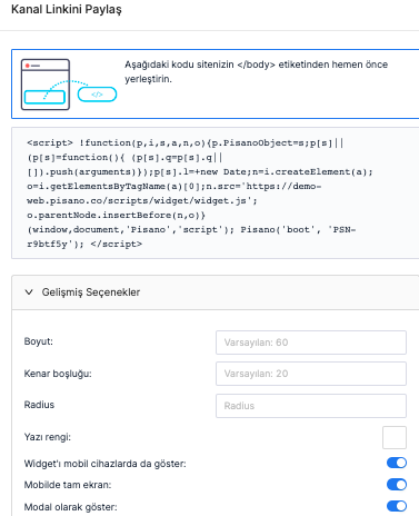 Yayınla’yı seçin ve Gelişmiş Ayarlar tıklayın. Açılan alanda web widget kanalınızı Modal olarak göster seçmelisiniz. Yine, üst kısımda belirtilen JavaScript kullanarak web widget kanalınızı web sitenize yerleştirebilirsiniz.