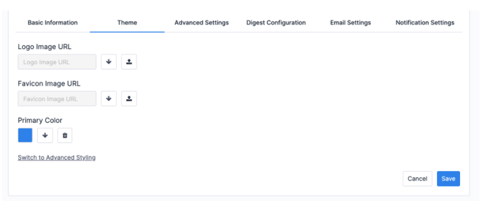 İleri butonuna tıkladıktan sonra Tema bölümüne ulaşacaksınız. Temada kanalın logolarını ve görsel detaylarını belirtebilirsiniz. Bu ekranda Logo Görseli URL'si başlıklı bölümde kanalınızın logosunu seçebilirsiniz. Favicon Image URL bölümü, tarayıcınızda kanalınızın simgesini seçmenize olanak tanır. Birincil Renk bölümünde kanalın genel teması olarak kullanılacak rengi seçebilirsiniz.