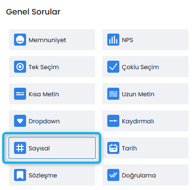 Bu soru tipini akışınıza eklemek için Akış oluşturma ekranının solunda bulunan soru menüsünden Sayısal'a tıklamanız yeterlidir.