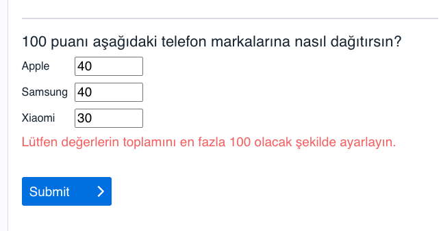 - Sayısal soru tipine çoklu seçenek desteği Sayesinde artık birden fazla sayısal alan tanımlayabilir ve bu alanların tümü için toplam minimum ve maksimum değer sınırları belirleyebilirsiniz. Katılımcılar bu sınırların dışına çıktığında sistem otomatik olarak uyarı mesajı gösterir.