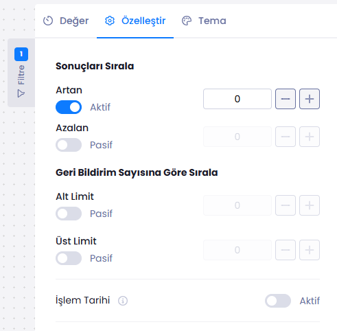 Özelliştir kısmından sonuçları artan veya azalan sırada gösterebilir, alt ve üst limit belirleyebilirsiniz.